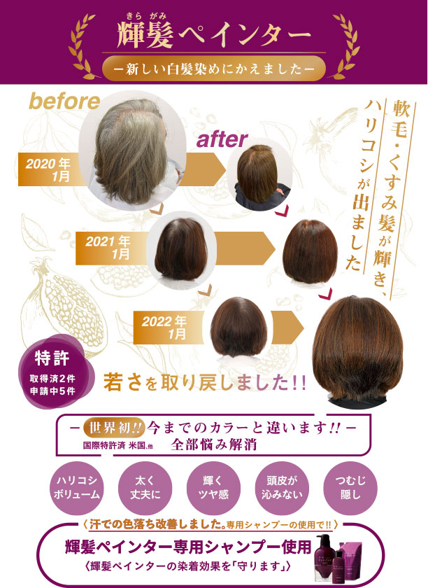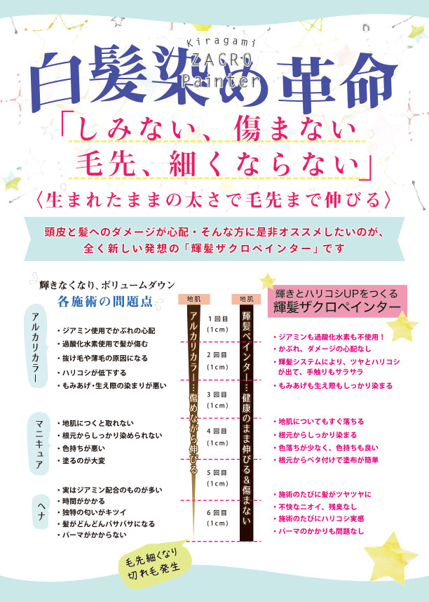 アルカリカラーと違い、ジアミンが入っておらず、ジアミンでかぶれる方でも白髪染めが出来ます。